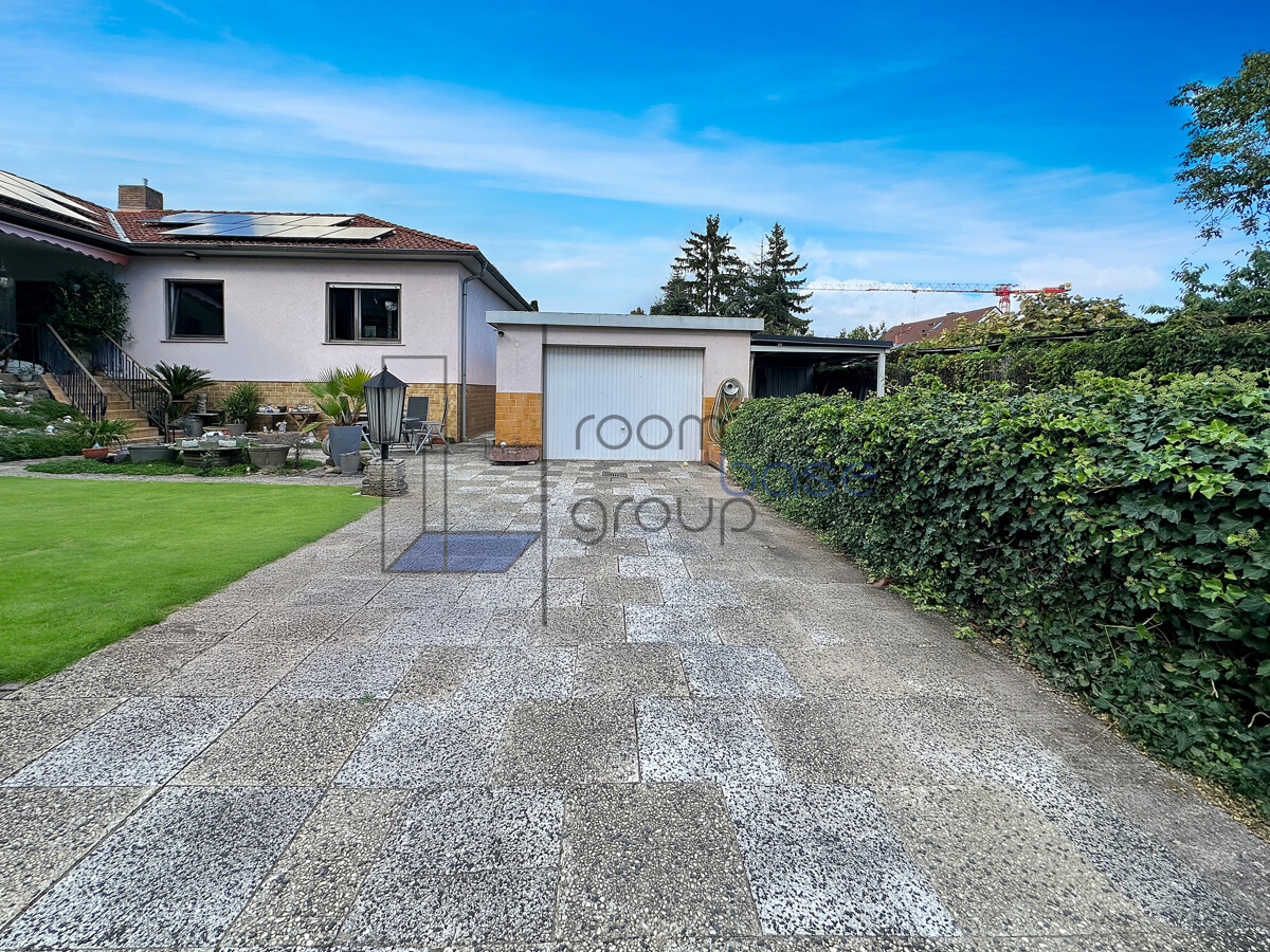 Eine großzügige Einfahrt mit Garage und danebenliegendem Carport schafft ausreichend Platz für Fahrzeuge, während ein weitläufiger Vorgarten mit Terrasse direkt am Haus zum Verweilen einlädt.