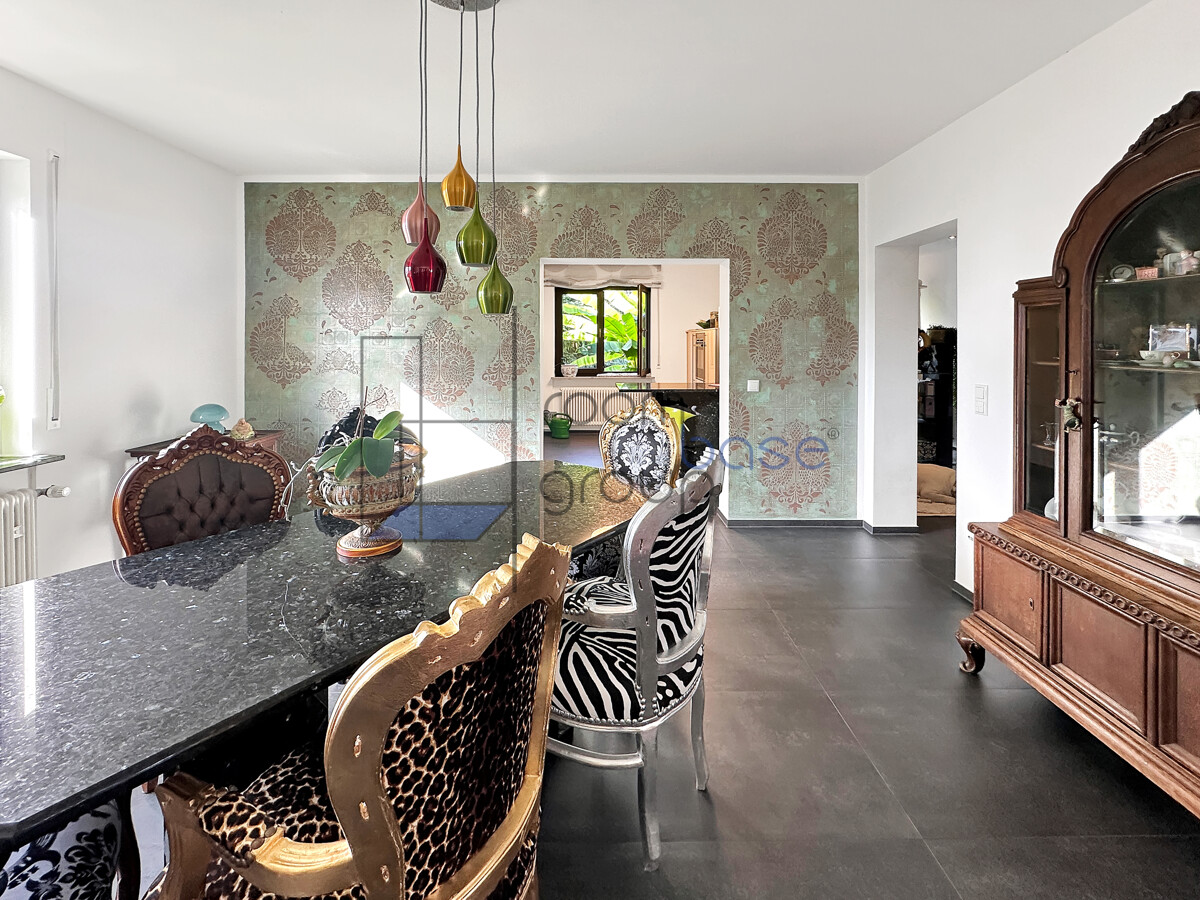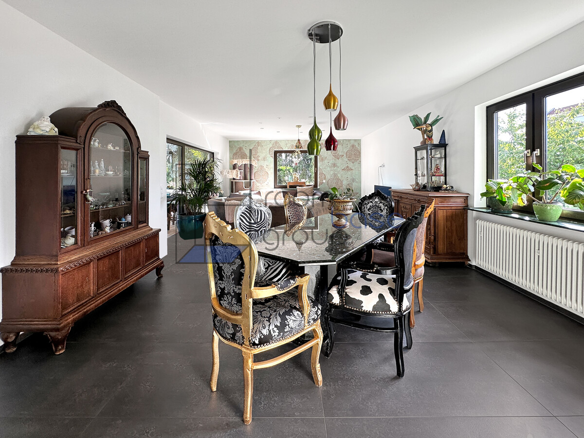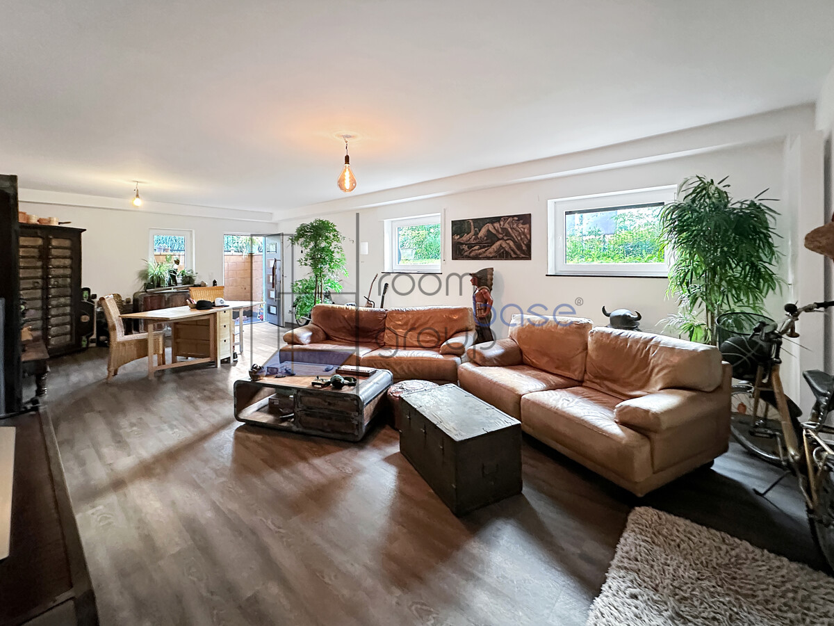 Die Hauptwohnung im Erdgeschoss/Hochparterre umfasst 3,5 Zimmer und besticht durch einen großzügigen Wohn- und Essbereich, der durch den direkten Zugang auf die Terrasse lichtdurchflutet wirkt und ein offenes Wohngefühl schafft.