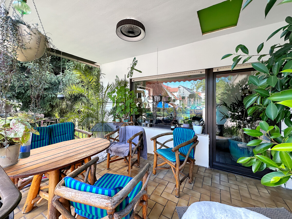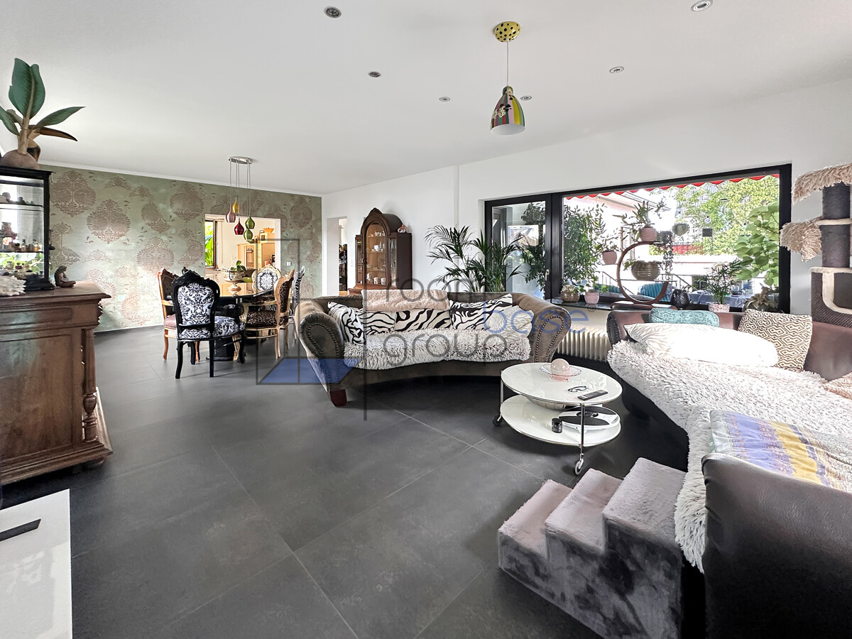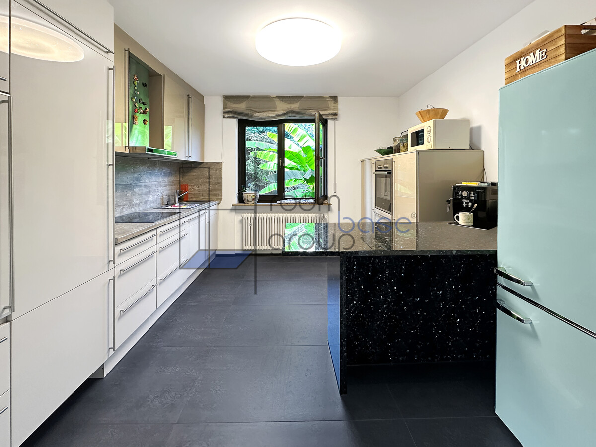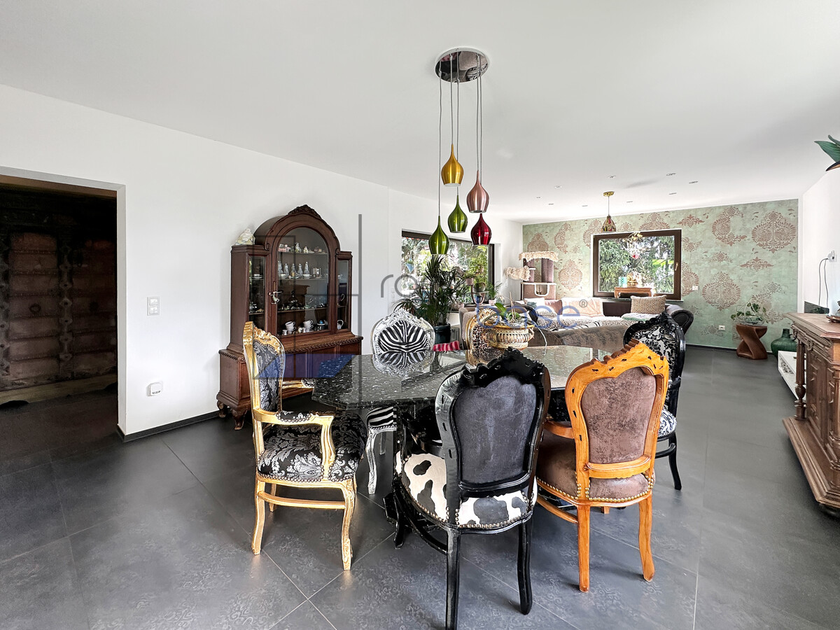 Die Hauptwohnung im Erdgeschoss/Hochparterre umfasst 3,5 Zimmer und besticht durch einen großzügigen Wohn- und Essbereich, der durch den direkten Zugang auf die Terrasse lichtdurchflutet wirkt und ein offenes Wohngefühl schafft.